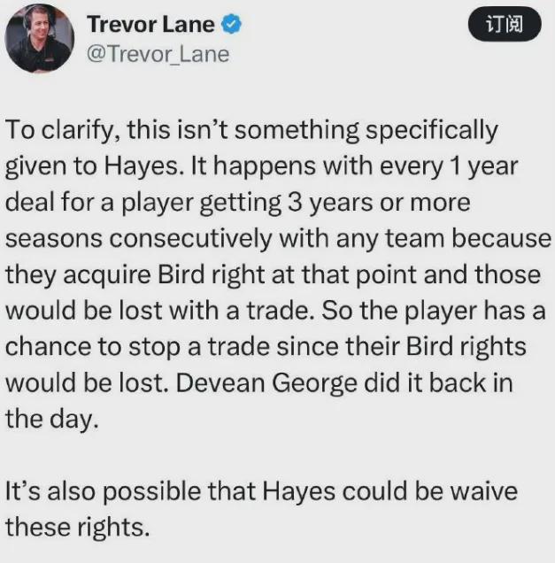 因为25-26赛季,为海斯效力湖人的第三个赛季,该赛季之后将获得伯德条款,于是接下来一年拥有的交易否决权,可以保护自己的伯德条款不被交易打断。