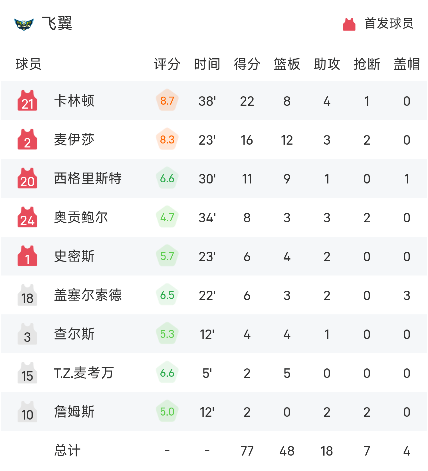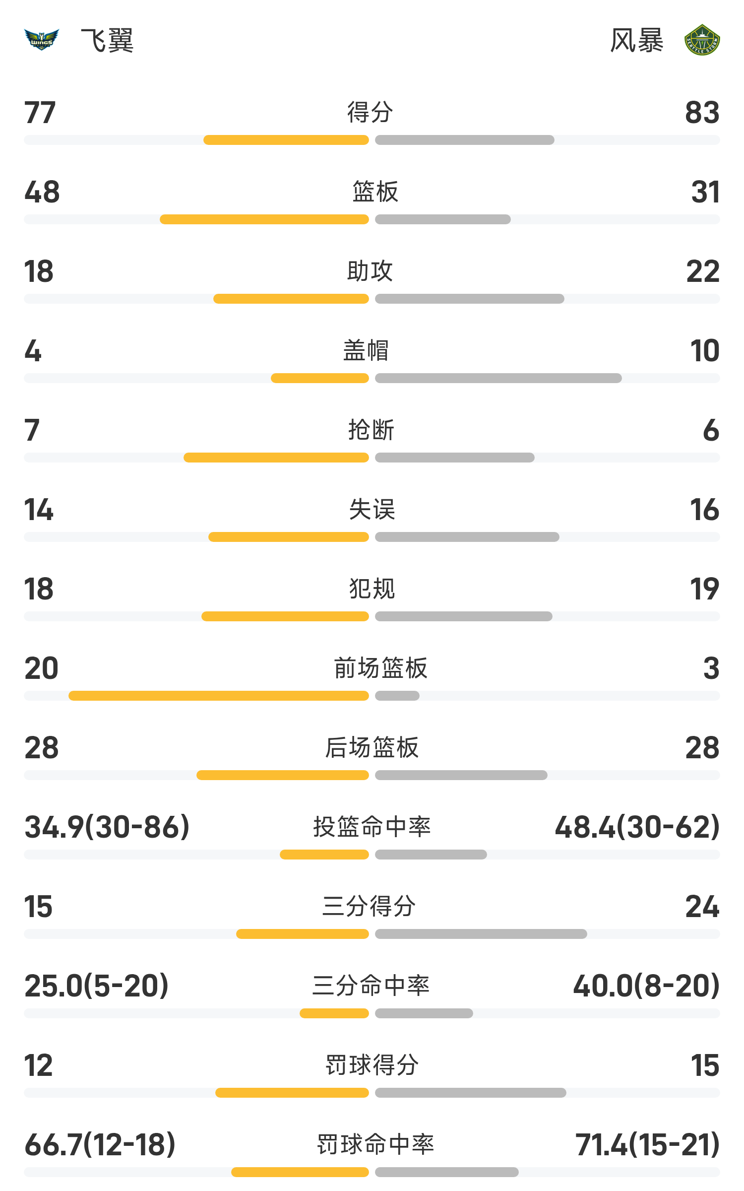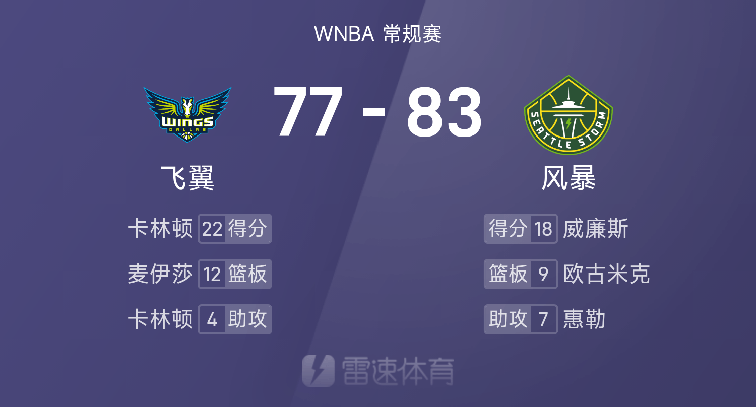25赛季WNBA 常规赛,风暴对阵飞翼。双方全场战罢,风暴83-77战胜飞翼。威廉斯得到18分3板4助率队取胜,卡林顿空砍全场最高的22分8板4助。